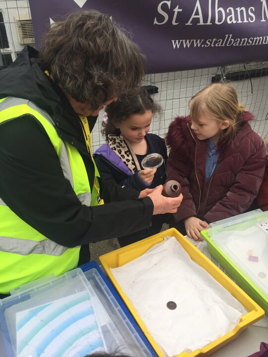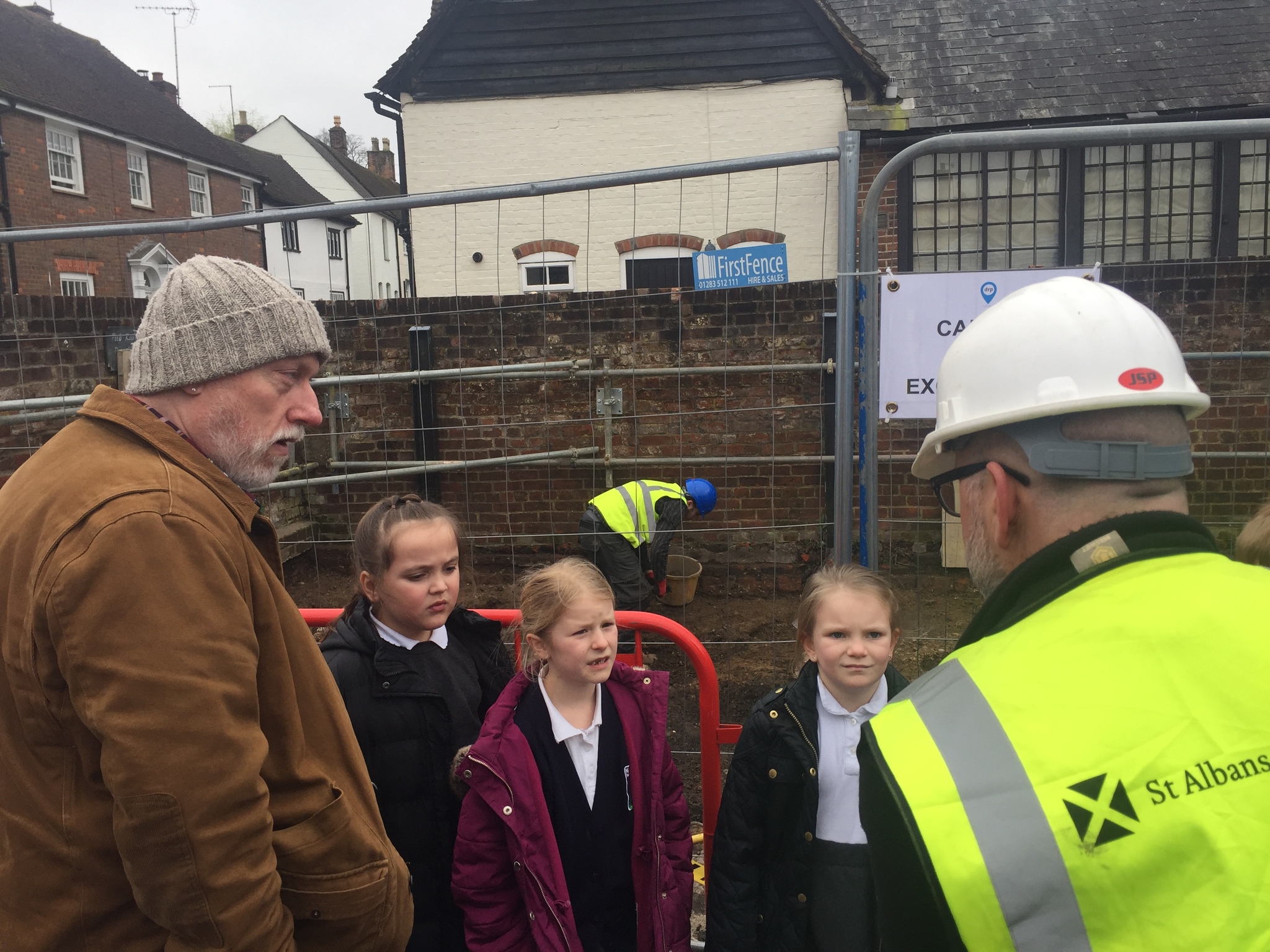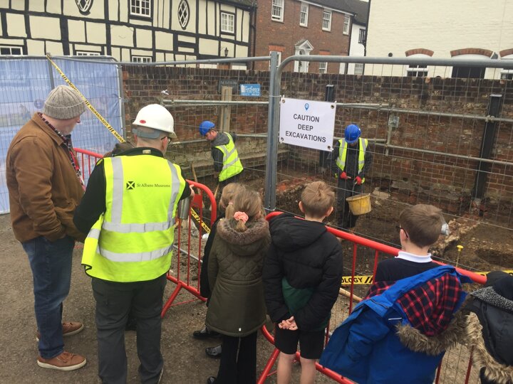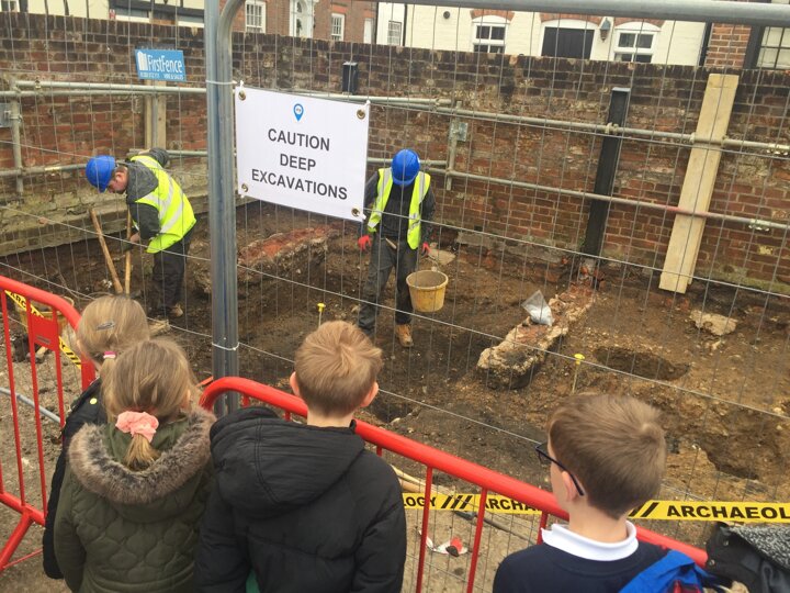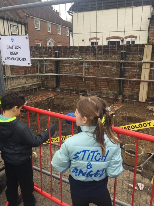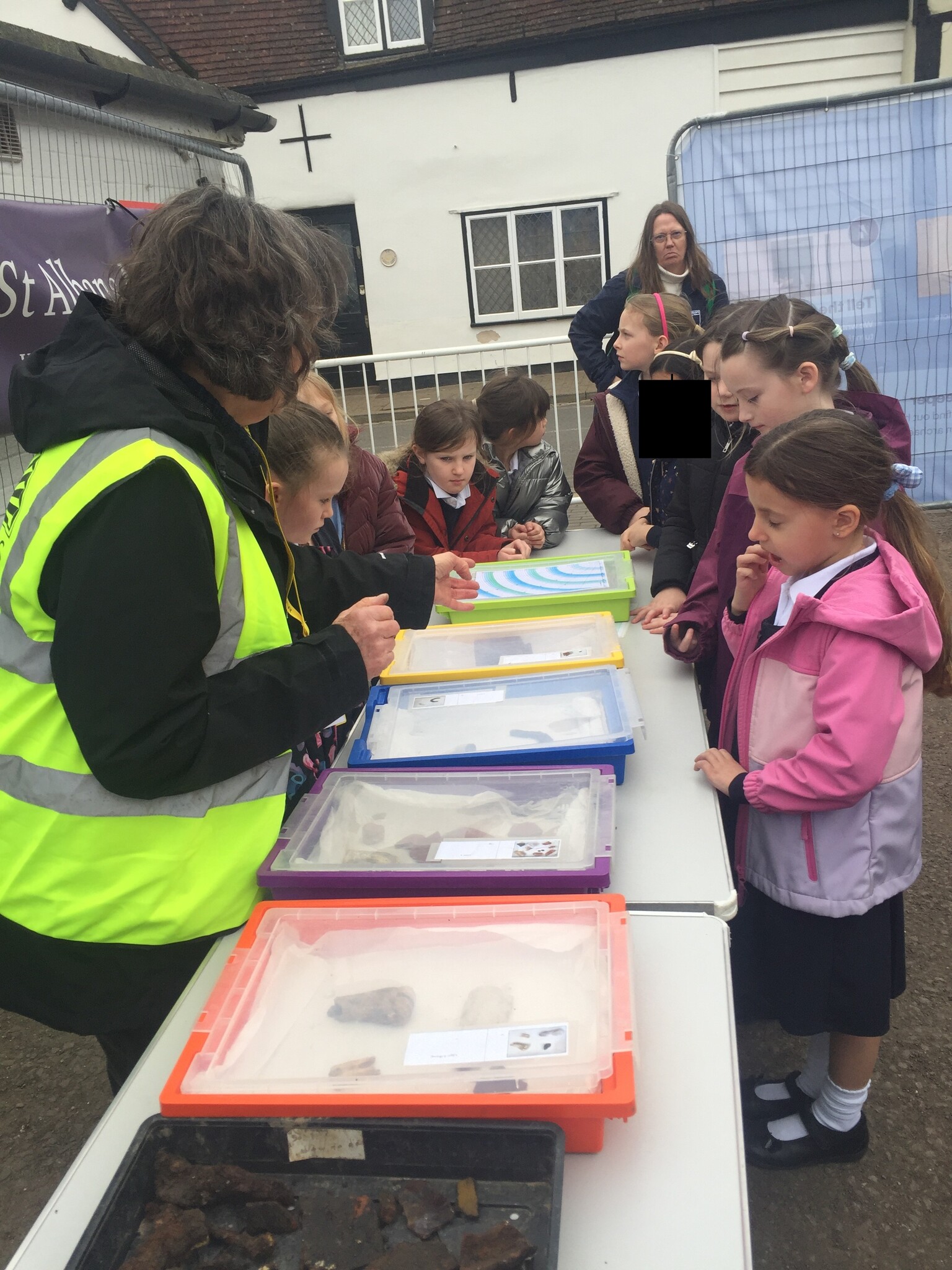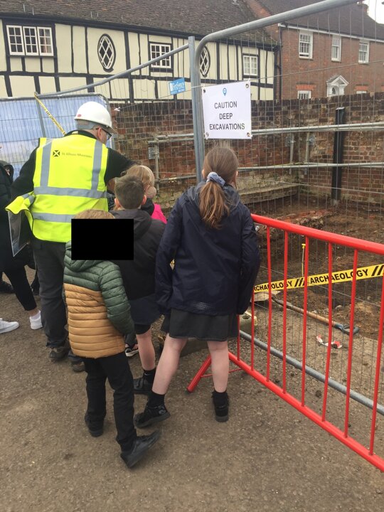 We also took a short walk down the road to visit a real archaeological dig near the Rose & Crown pub on St Michael’s Street. Archaeologists are excavating the area as part of a redevelopment project, uncovering layers of history that stretch back thousands of years, including evidence from the Iron Age, Roman, Anglo-Saxon and medieval periods. The children were fascinated to see the dig in progress and to learn how archaeologists carefully uncover and study artefacts to help us understand the past.